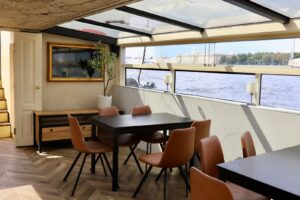 Закрытый салон, в салоне 10 столов и 42 стульев, плазма, микрофон, встроенная аудиосистема, санузел.Открытая палуба с мягким диваном по корме и складными стульями.