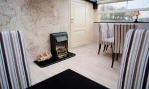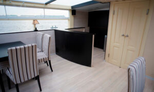 Закрытый салон, в салоне 5 столов и 21 стул, два мягких диванчика, плазма, микрофон, встроенная аудиосистема, санузел.Открытая палуба с мягким диваном по корме и складными стульями.