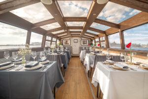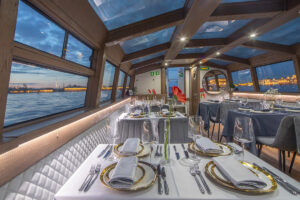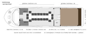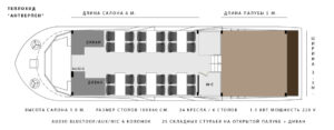 Закрытый салон, в салоне 10 столов и 42 стульев, плазма, микрофон, встроенная аудиосистема, санузел.Открытая палуба с мягким диваном по корме и складными стульями.