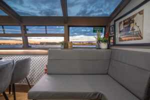 Закрытый салон, в салоне 4 стола и 16 стульев, диван и овальный стол, микрофон, встроенная аудиосистема, санузел, чайник.Открытая палуба диванчик с складными стульями.