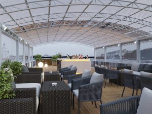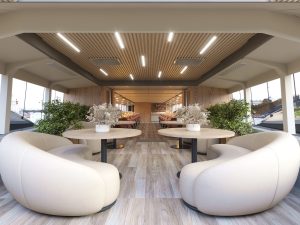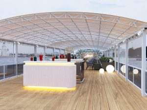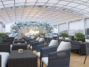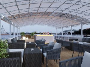 Новинка сезона 2026 — элегантный двухпалубный теплоход «Аврора-1» для незабываемых прогулок и мероприятий по Петербургу. Верхняя палуба: Открытая лаунж-зона с панорамными видами и фотозоной.