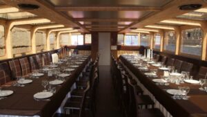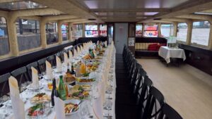 Двухпалубный теплоход.Закрытый салон нижняя палуба, в салоне 11 столов, общий диван в носовой части, плазма 2 шт, микрофон, встроенная аудиосистема, барная стойка, кондиционер, санузел.
