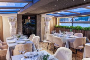 Закрытый салон, в салоне 8 столов прямоугольных и 3 круглых, плазма, микрофон, встроенная аудиосистема, барная стойка, санузел, кондиционер.Открытая палуба с складными стульями.