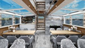 Закрытый салон, в салоне 10 столов и 42 стульев, плазма, микрофон, встроенная аудиосистема, санузел.Открытая палуба с мягким диваном по корме и складными стульями.