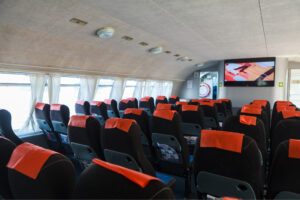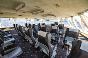 Закрытый салон, в салоне 10 столов и 42 стульев, плазма, микрофон, встроенная аудиосистема, санузел.Открытая палуба с мягким диваном по корме и складными стульями.