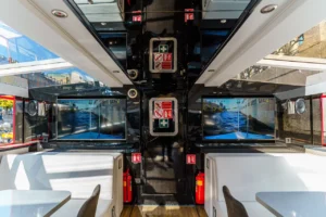 Закрытый салон, в салоне 10 столов и 42 стульев, плазма, микрофон, встроенная аудиосистема, санузел.Открытая палуба с мягким диваном по корме и складными стульями.