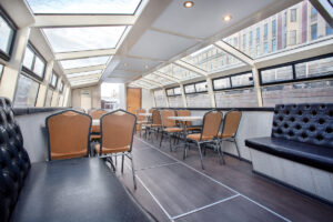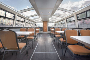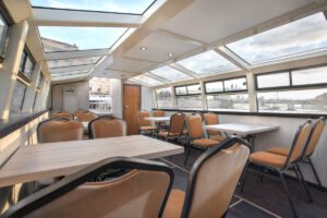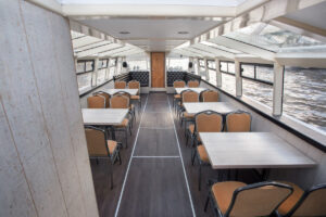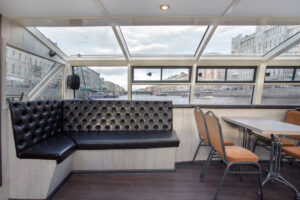Закрытый салон, в салоне 10 столов и 42 стульев, плазма, микрофон, встроенная аудиосистема, санузел.Открытая палуба с мягким диваном по корме и складными стульями.