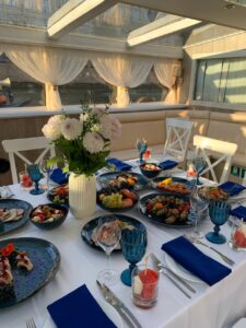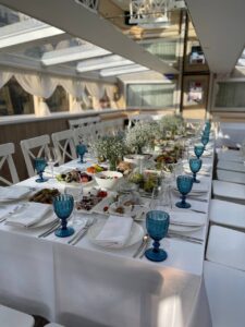Пассажировместимость 35 человек. Банкетная рассадка на 20 гостей за разными столами. Банкетная рассадка на 12 гостей одним столом. Фуршетная рассадка до 30 гостей.7 500 руб\час