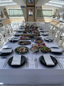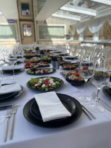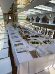 Два теплохода близнеца.Закрытый салон, в салоне 4 стола и 16 стульев, 2 диванчика, плазма, микрофон, встроенная аудиосистема, барная стойка, кондиционер, санузел.