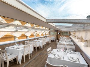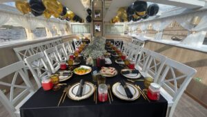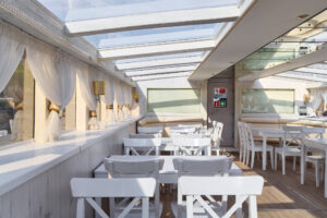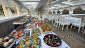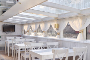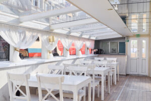 Закрытый салон, в салоне 10 столов и 42 стульев, плазма, микрофон, встроенная аудиосистема, санузел.Открытая палуба с мягким диваном по корме и складными стульями.