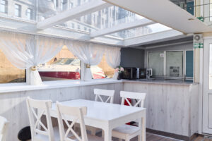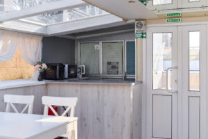 Закрытый салон, в салоне 8 столов и 35 стульев, 2 диванчика, плазма, микрофон, встроенная аудиосистема, барная стойка, кондиционер, санузел.