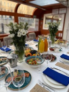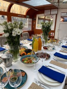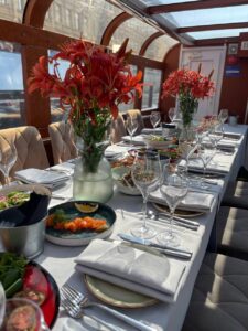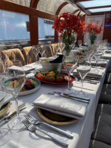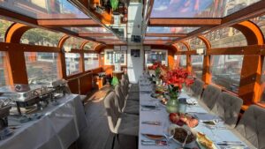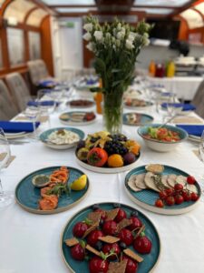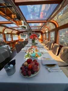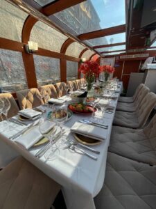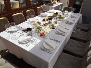 Пассажировместимость 35 человек. Банкетная рассадка на 20 гостей за разными столами. Банкетная рассадка на 12 гостей одним столом. Фуршетная рассадка до 30 гостей.7 500 руб\час