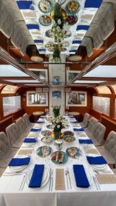 Закрытый салон, в салоне 10 столов и 42 стульев, плазма, микрофон, встроенная аудиосистема, санузел.Открытая палуба с мягким диваном по корме и складными стульями.
