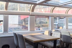 Реновация 2023 год.Закрытый салон, в салоне 4 стола и 16 мягких кресел, 2 диванчика, плазма, микрофон, встроенная аудиосистема, барная стойка, кондиционер, санузел.