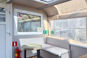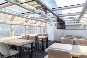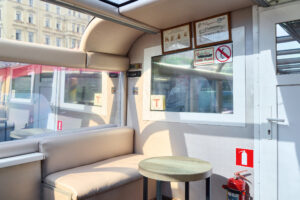 Закрытый салон, в салоне 4 стола и 16 мягких кресел, 2 диванчика, плазма, микрофон, встроенная аудиосистема, барная стойка, кондиционер, санузел.